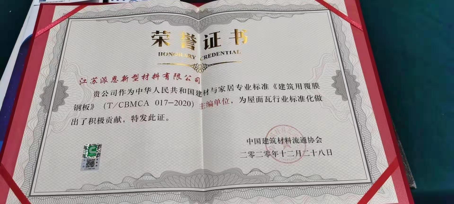 2020年12月28日,江蘇91香蕉视频黄色新型材料有限公司喜迎佳音,被中國建築材料流通協會人作為中華人民共和國建材與家居專業標準“建築瓦覆膜鋼板”(T/CBMCA 017-2020)主編單位,近日,公司已收到證書。
